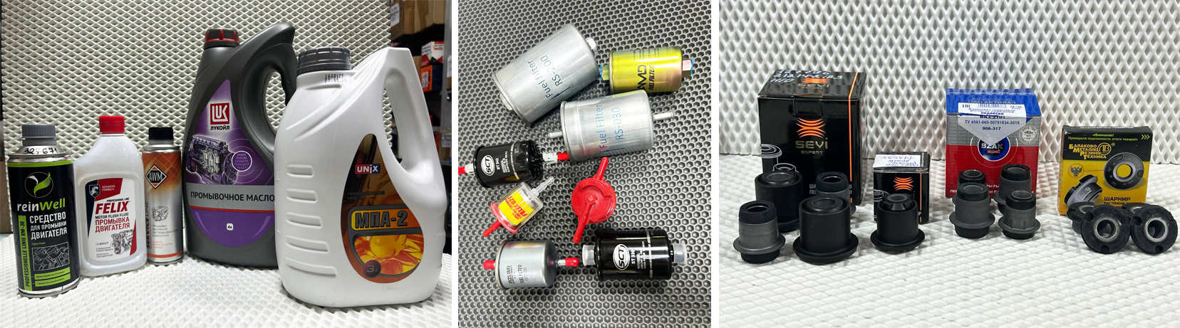 Фильтры масляные, воздушные и фильтры салона, масла, тормозная жидкость, антифриз, тормозные колодки, стойки стабилизатора, сайлентблоки, рулевые наконечники, тяги рулевые, втулки стабилизатора, подшипники ступицы, шаровые опоры, пружины и др.
